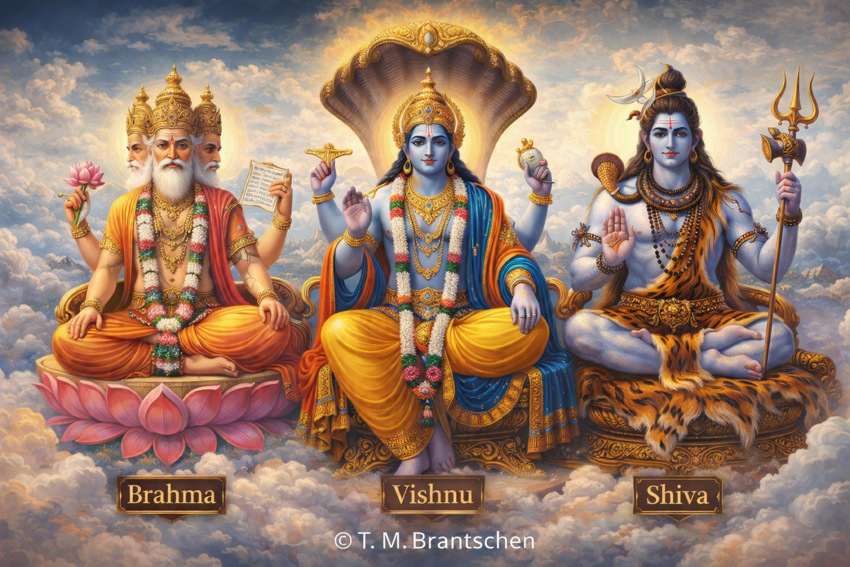Illustration von Brahma, Vishnu und Shiva – Trimurti der hinduistischen Schöpfung, Erhaltung und Transformation.