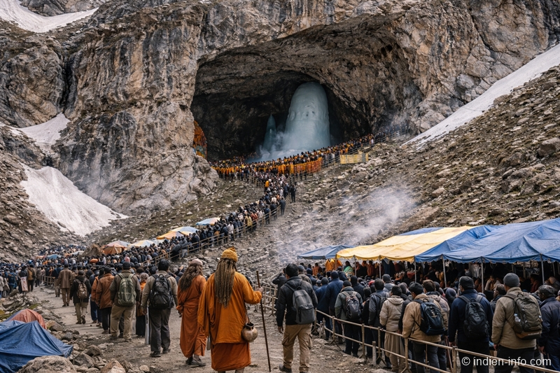 Die Amarnath Yatra führt zur heiligen Amarnath-Höhle im Himalaya von Jammu und Kaschmir. In der Höhle bildet sich aus Eis ein natürlicher Shiva-Lingam, der als Manifestation Shivas verehrt wird. Die Pilgerreise gilt als Prüfung von Hingabe, Ausdauer und innerer Klarheit. Der Weg ist anspruchsvoll und bewusst reduziert – Würde entsteht hier durch Einfachheit.