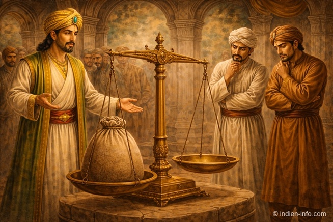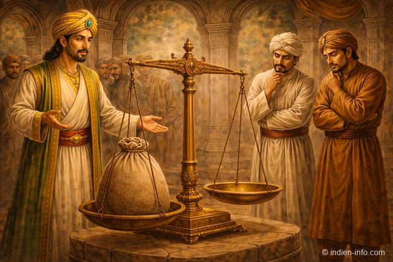 Nach dem dritten Mal war der Sack schwer. Birbal hob ihn an, ließ ihn auf die Waagschale fallen und sagte:„Das sind deine Worte.“