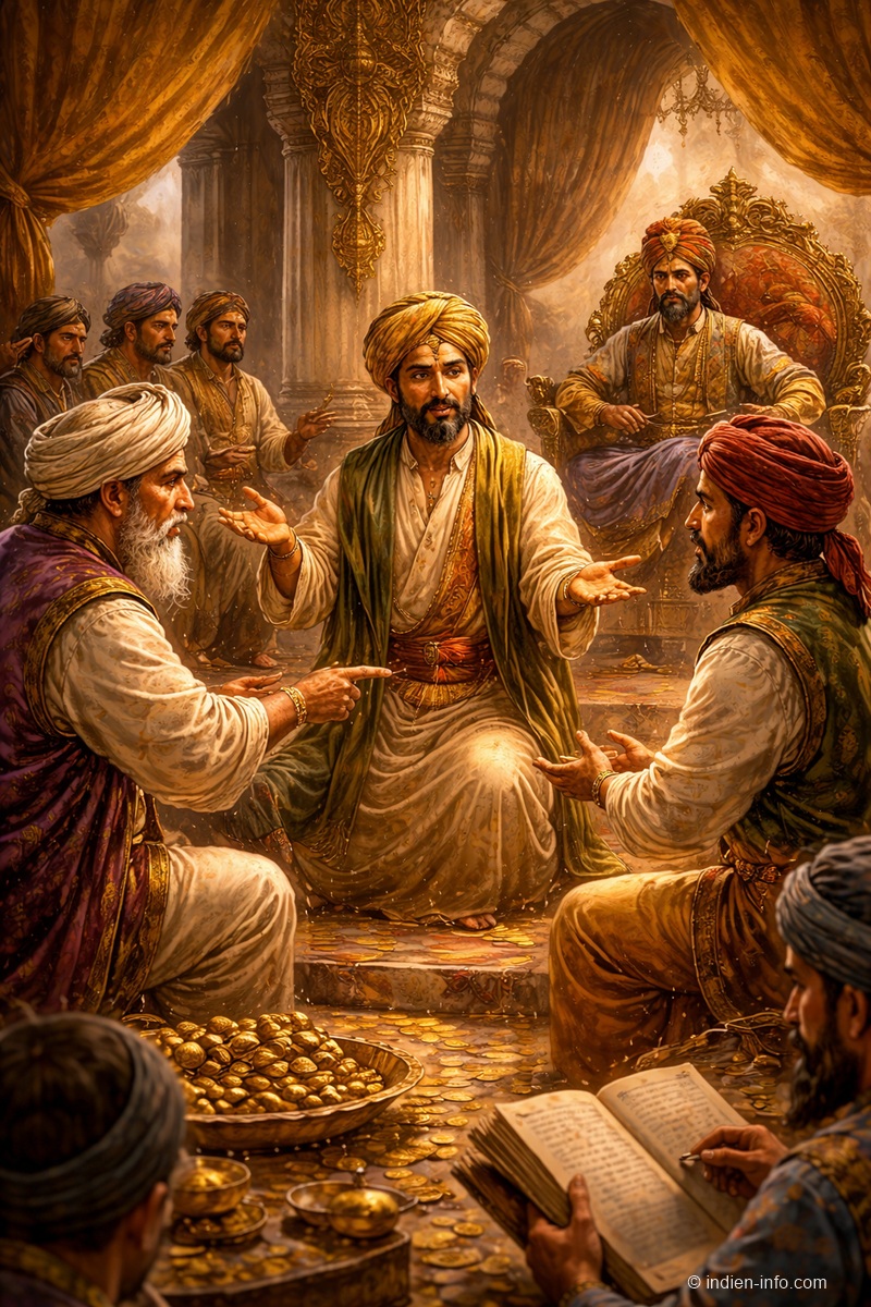 „Das Geld“, fuhr Birbal fort, „geht zurück in das Geschäft, aus dem es entstanden ist. Ihr arbeitet weiter zusammen. Ein Jahr lang. Danach kommt ihr wieder – und erzählt mir nicht, wer recht hatte, sondern ob es euch besser geht.“