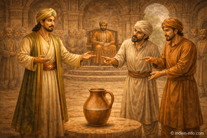 Birbal nahm den Krug, wog ihn kurz in der Hand und stellte ihn dann auf den Boden.„Majestät“, sagte er ruhig, „der Krug ist vollständig zurückgegeben worden.“