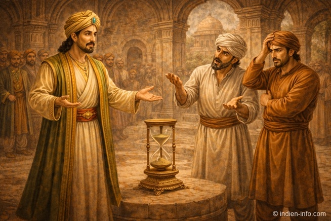 Eines Morgens erschien ein Mann am Hof von Kaiser Akbar, sichtbar empört.„Majestät“, sagte er, „mein Nachbar hat mir Zeit gestohlen.“