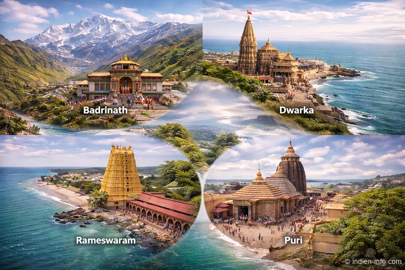 Die Char Dham Yatra verbindet vier zentrale Heiligtümer an den geografischen Rändern Indiens. Badrinath im Norden, Dwarka im Westen, Puri im Osten und Rameswaram im Süden stehen symbolisch für eine spirituelle Umrundung des Subkontinents. Die Reise gilt als ganzheitlicher Weg der Vervollständigung: Wer alle vier Dham besucht, richtet sein Leben neu aus – ruhig, schlicht und bewusst.