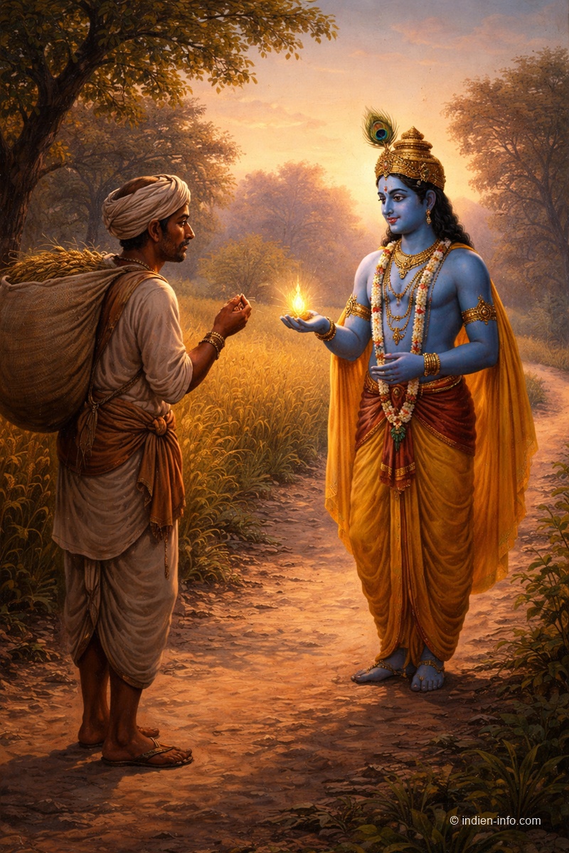 Manchmal begegnet Weisheit nicht in Tempeln, sondern auf staubigen Feldwegen. Diese Geschichte erzählt von einem Bauern, der hart gearbeitet hat und sich über seine Ernte freut. Als ihm Krishna begegnet, scheint die Bitte einfach – und ist doch alles andere als das. Ohne Drohung, ohne Belehrung zeigt sich, wie schnell der Mensch zu rechnen beginnt. Die Handlung ist schlicht, fast alltäglich, und gerade darin liegt ihre Tiefe. Was gegeben wird, ist klein. Was erkannt wird, ist größer. Die Weisheit entsteht nicht aus Worten, sondern aus dem stillen Nachgeschmack der Begegnung.