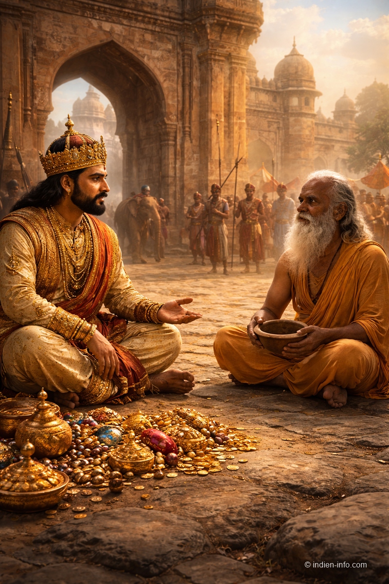 Vor den Toren einer alten indischen Stadt saß ein Bettler im Staub. Er hatte nichts bei sich außer einer kleinen Schale und einem Blick, der erstaunlich ruhig war. Tag für Tag gingen Menschen an ihm vorbei: Händler, Soldaten, Pilger. Manche gaben etwas, viele nichts.