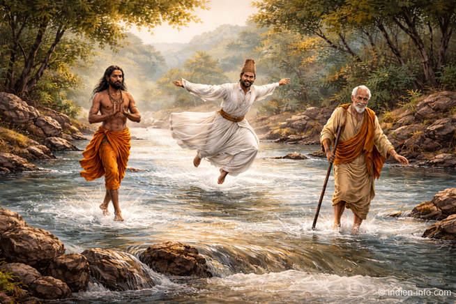 Der Yogi trat vor.„Ich zeige euch, wie man einen Fluss überquert“, sagte er ruhig.Er schloss die Augen, setzte einen Fuß auf das Wasser – und ging tatsächlich über die Oberfläche, Schritt für Schritt, bis er das andere Ufer erreichte.