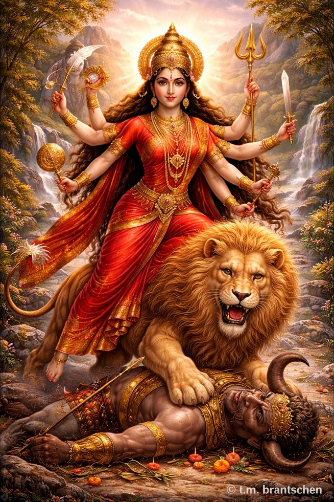 Aus dem Zorn und der Energie der Götter – insbesondere Shivas und Vishnus – entstand daraufhin Durga. Jeder Gott überreichte ihr seine eigene Waffe, und so zog sie als strahlende, überirdische Gestalt in den Kampf. Mahisasura wechselte währenddessen ständig seine Gestalt, doch Durga besiegte ihn schließlich in seiner Büffelform. Dieser Sieg steht sinnbildlich für die Wiederherstellung der kosmischen Ordnung.