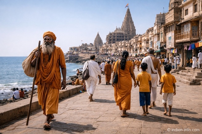 Dwarka-Stadt.Die Yatra beginnt traditionell am Meer oder am Dwarkadhish-Tempel.