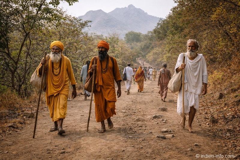 Lange Gehzeiten, Staub und wechselnde Temperaturen erfordern gute Kondition. Die Parikrama ist kein Spaziergang, sondern eine ernsthafte Pilgerpraxis. Respekt gegenüber Sadhus, Jain-Mönchen und lokalen Ritualen ist selbstverständlich.