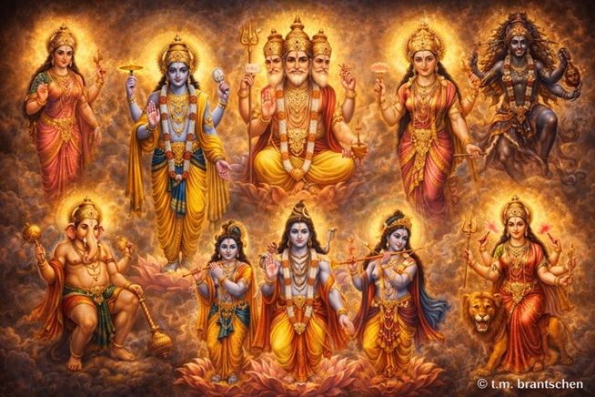 Zentrale Darstellung der hinduistischen Hauptgötter Vishnu, Shiva und Brahma in der Mitte des Bildes, umgeben von weiteren bedeutenden Gottheiten: Parvati, Ganesha, Hanuman, Krishna, Durga, Kali und Lakshmi. Jede Figur ist mit typischen Attributen, Gesten und Symbolen dargestellt und von einer leuchtenden Aura umgeben. Die Komposition verdeutlicht die Vielschichtigkeit des hinduistischen Götterpantheons und die unterschiedlichen Aspekte von Schöpfung, Erhaltung, Zerstörung, Schutz und spiritueller Kraft.