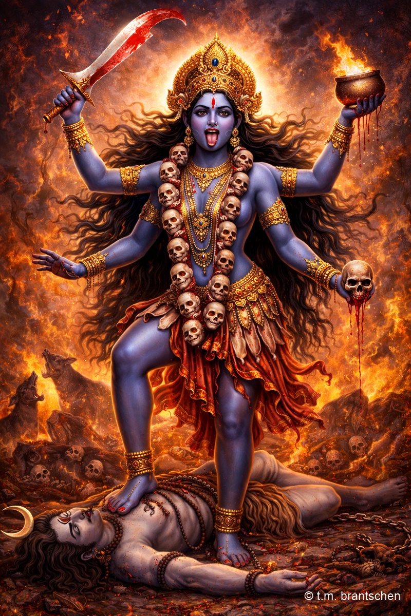 Darstellung der Göttin Kali als kraftvolle Manifestation der Shakti. Kali erscheint mit dunkler Hautfarbe, mehreren Armen, hervorgestreckter Zunge und dem dritten Auge. Sie trägt eine Kette aus Schädeln und hält typische Attribute wie Schwert, abgeschlagenen Kopf und Blutschale. Kali steht auf dem reglosen Körper Shivas, was ihre Rolle als dynamische Energie und transformative Kraft symbolisiert. Die feurige, chaotische Umgebung unterstreicht ihre Funktion als Zerstörerin von Illusion, Ego und Unwissenheit sowie als Göttin von Zeit, Tod und Erneuerung.Kali