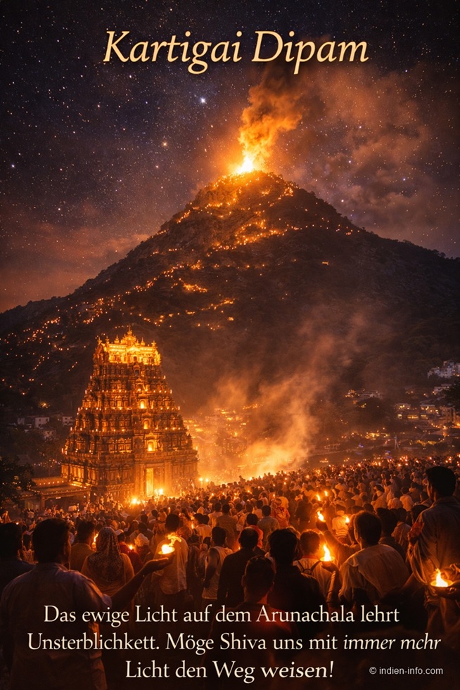 ist das südindische Fest des göttlichen Lichts. Im Mittelpunkt steht der Berg Arunachala, der selbst als lebendige Manifestation Shivas verehrt wird. Ein gewaltiges Feuer auf seinem Gipfel erinnert daran, dass das höchste Licht nicht außen, sondern im Inneren brennt. Kartigai Dipam verbindet äußeres Ritual mit innerer Erkenntnis. Es ist ein Fest der Klarheit, der Reinigung und des stillen Erwachens. Wer hinsieht, erkennt: Das Licht sucht keinen Schalter – es ist immer schon da.