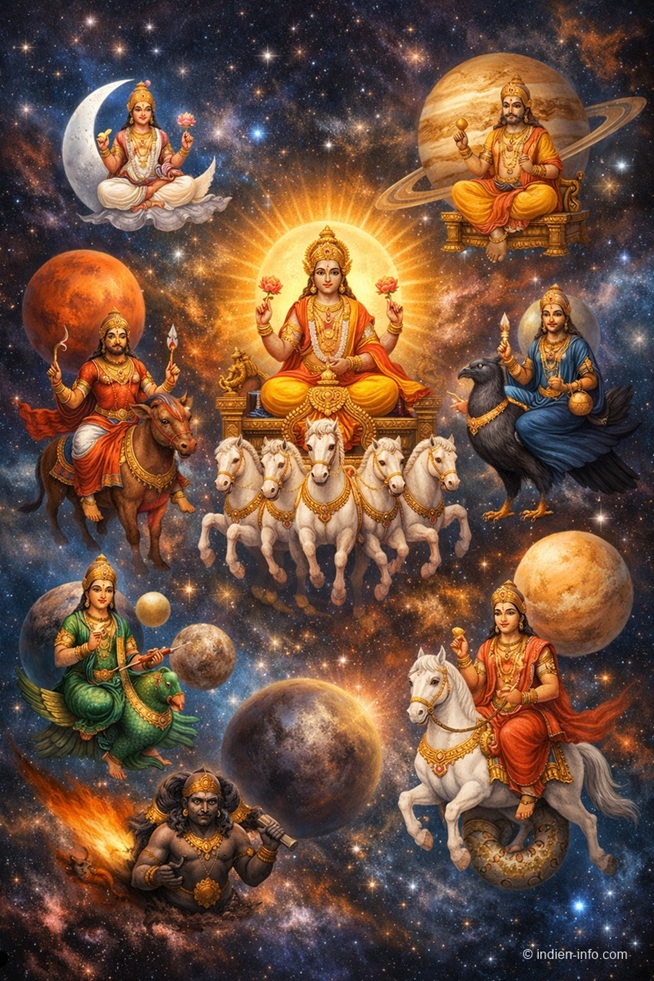 neun Himmelskörper, die zugleich als göttliche Kräfte (Devatas) verstanden werden. Sie beeinflussen Karma, Zeitqualität und Lebensereignisse.