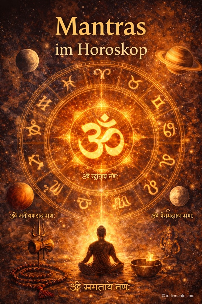 Künstlerische Darstellung zum Thema Mantras im Horoskop (Jyotisha): Leuchtendes OM im Zentrum eines vedischen Tierkreises, umgeben von Planeten und kosmischer Energie. Meditierende Figur im Vordergrund symbolisiert Mantra-Rezitation zur Harmonisierung planetarer Einflüsse. Goldene und warme Farbtöne stehen für Klang, Schwingung und astrologische Ordnung. © indien-info.comMantras im Horoskop – spirituelle Klangmittel in der vedischen Astrologie