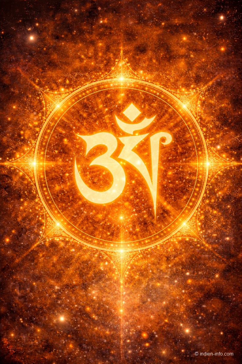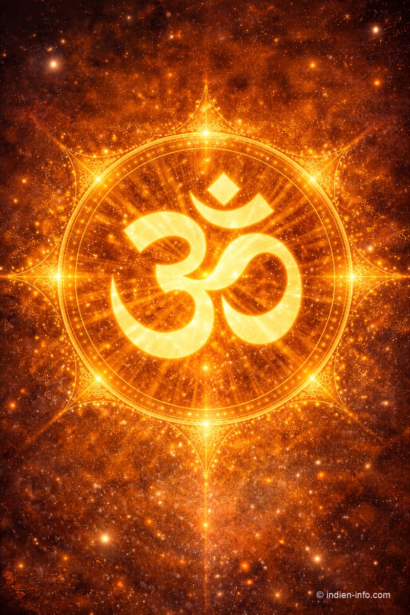 Zentriertes, leuchtendes OM-Symbol (AUM) in goldenen Farbtönen vor kosmischem Hintergrund. Feine Lichtstrahlen und harmonische Formen symbolisieren Urschwingung, Bewusstsein und spirituelle Einheit. Ruhig, klar und hochwertig gestaltet – geeignet als zentrales Symbol für spirituelle Inhalte auf indien-info.com. © indien-info.comOM – Bedeutung, Ursprung und spirituelle Wirkung des Urklangs