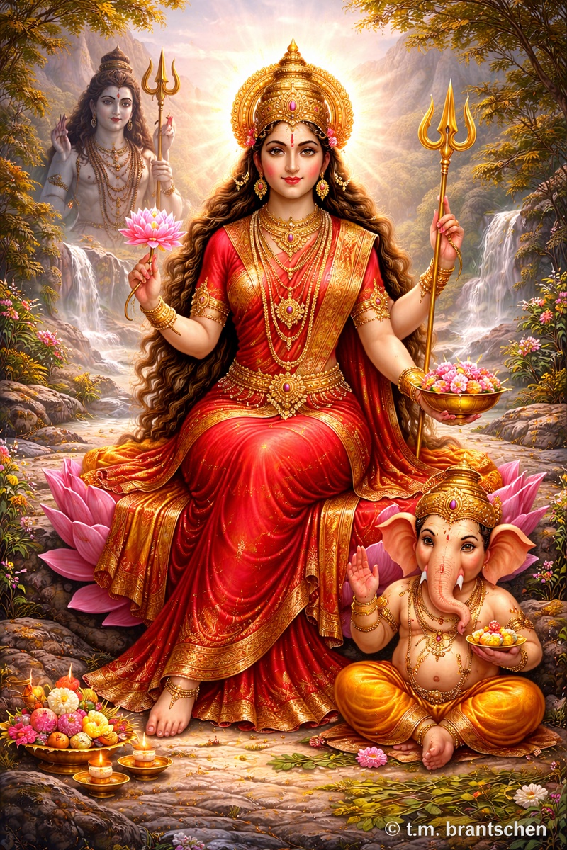 Darstellung der Göttin Parvati als sanfter, mütterlicher Aspekt der Shakti. Parvati sitzt auf einer Lotusblüte, reich geschmückt und in rotes Gewand gekleidet, mit Segens- und Schutzgeste. Zu ihren Füßen befindet sich ihr Sohn Ganesha, während Shiva im Hintergrund ruhig und asketisch erscheint. Die Szene spielt in einer bergigen Landschaft und symbolisiert Familie, göttliche Energie, Schutz und Harmonie im hinduistischen Weltbild.Parvati