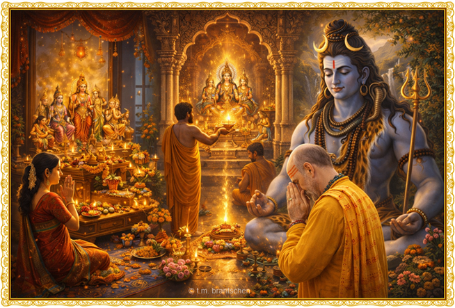 Symbolische Darstellung von Puja: Verehrung der Götter im häuslichen Schrein, im Tempel und in der Natur als eine zusammenhängende spirituelle Handlung. Licht, Opfergaben, Feuer und Gebet verbinden Mensch, Gottheit und Natur zu einer Einheit. Ausdruck von Hingabe, Ritual und gelebter Spiritualität im Alltag.Puja – Bedeutung, Ablauf und Formen hinduistischer Verehrung