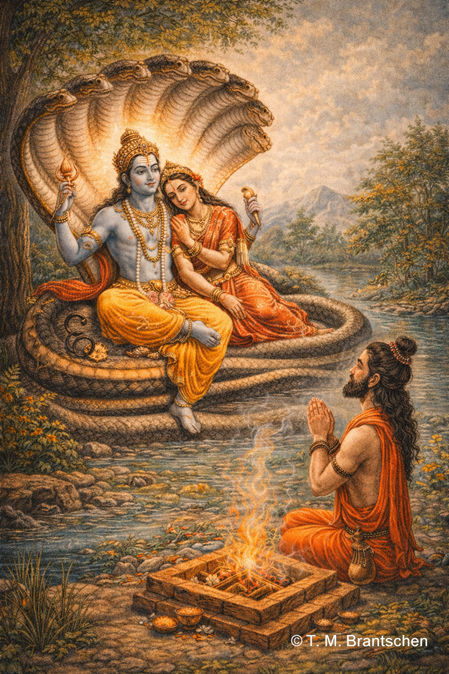 Schon in jungen Jahren erkannte er die Vergänglichkeit des Lebens und wandte sich ohne Furcht der Verehrung Vishnus zu. Seine Askese war geprägt von Vertrauen, innerer Sammlung und völliger Hingabe an das Göttliche.In den Puranas wird berichtet, dass Markandeya während der kosmischen Auflösung Vishnu begegnete, der auf der Weltschlange Ananta ruhte. Diese Vision machte ihn zum Zeugen der zeitlosen Wirklichkeit jenseits von Geburt und Tod.Markandeya symbolisiert den Menschen, der durch Hingabe und Erkenntnis das Vergängliche überwindet. Seine Gestalt steht für Beständigkeit, spirituelle Tiefe und die Kraft des Vertrauens in das Göttliche.