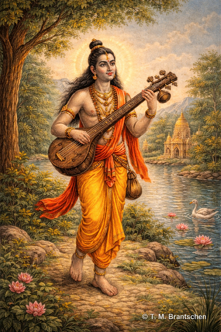 Er erscheint in vielen Puranas und Epen als Wanderer, Musiker und Lehrer, der mit seiner Vina den Namen Vishnus preist. Narada bewegt sich frei zwischen Himmel, Erde und den göttlichen Sphären.