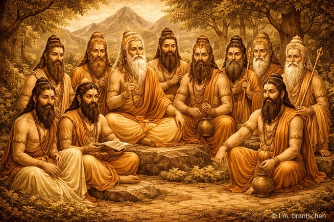 Dargestellt ist eine Gruppe von elf Rishis, den vedischen Weisen Indiens, versammelt in einer ruhigen Waldlandschaft. Die Rishis sitzen und stehen in meditativer Haltung, einige mit Gebetsketten oder Palmblatt-Schriften. Das Bild symbolisiert Wissen, Meditation, Weitergabe spiritueller Erkenntnis und die lebendige Tradition der Veden. Das Gesamtbild ist bewusst im alten, historischen Stil gehalten.Was ist ein Rishi? – Bedeutung, Ursprung und Rolle im Hinduismus