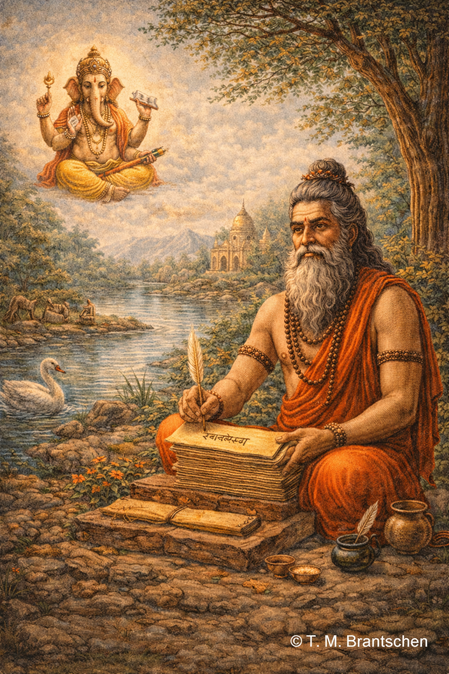 Mit Vyasa verbindet man vor allem das Mahabharata, das als eines der größten Epen der Weltliteratur gilt, sowie die Puranas. In vielen Darstellungen erscheint er als Autor und Lehrer, der nicht nur Geschichten erzählt, sondern ethische und spirituelle Orientierung gibt: Dharma, Verantwortung, Wahrheit und die Folgen menschlichen Handelns.