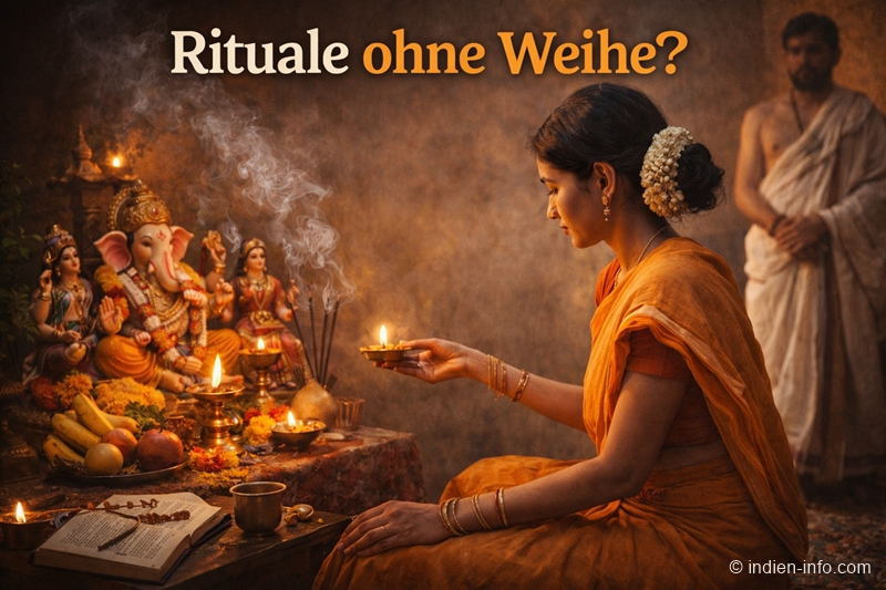 Im Hinduismus gibt es keine zentrale Autorität, die Rituale „erlaubt“ oder „verbietet“. Viele Rituale sind häusliche Praxis: Gebete, Mantras, Puja, Räucherwerk oder Opfergaben werden täglich von ganz normalen Menschen ausgeführt – ohne Priester, ohne Weihe.