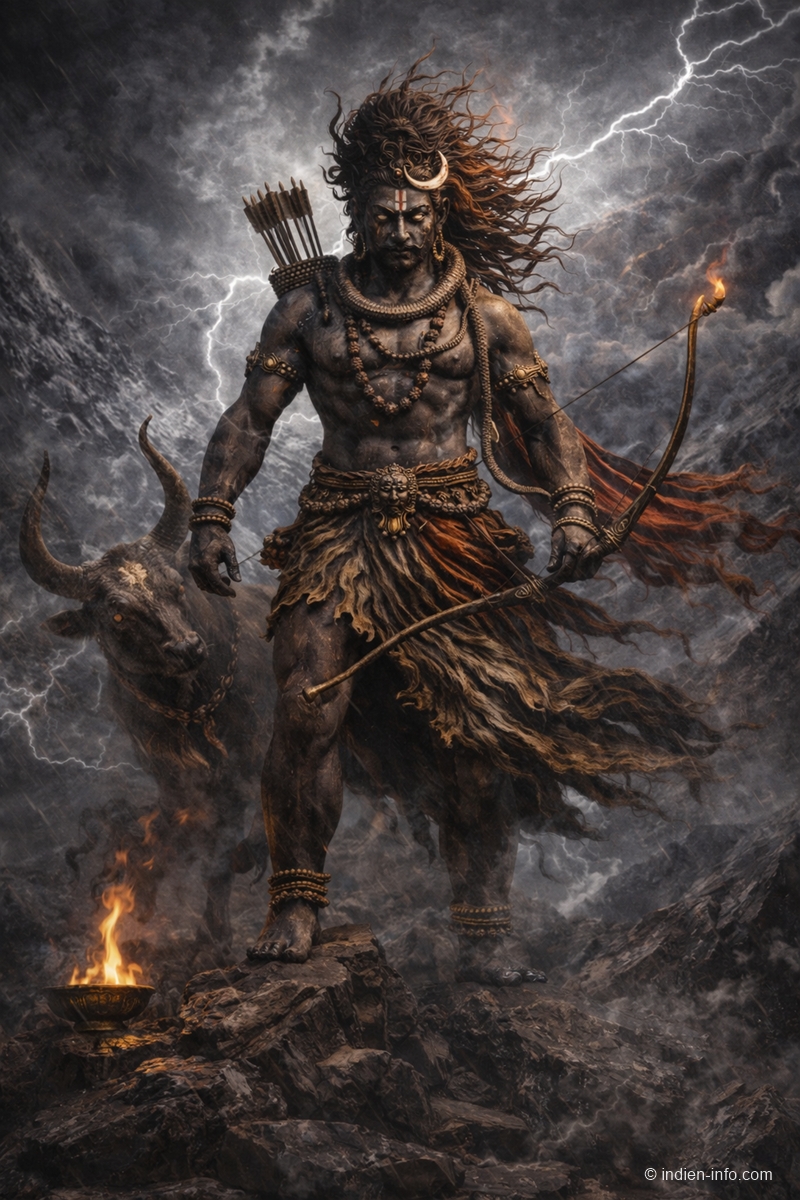 Rudra ist der Gott der Stürme, des Donners und der Wildnis. Er wird gefürchtet, aber zugleich verehrt, denn er bringt sowohl Leid als auch Heilung. In den vedischen Hymnen wird er als der „Heiler mit tausend Arzneien“ angerufen, dessen Pfeile Krankheit verursachen, aber auch wieder zurücknehmen können. Diese Doppelrolle macht Rudra einzigartig.