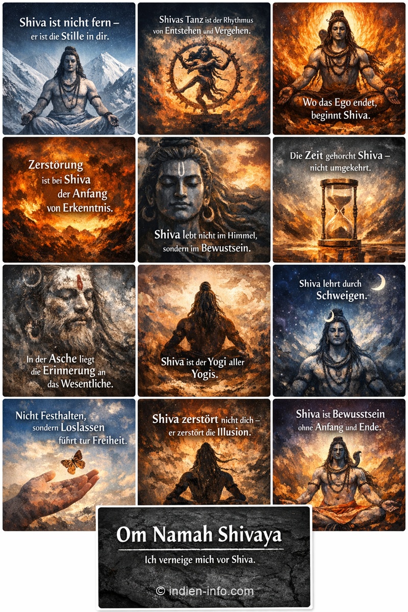 Shiva-Zitate und Bilder verbinden Worte und Symbole zu einer stillen Form der Erkenntnis. Sie verdichten komplexe spirituelle Lehren auf wenige Zeilen oder ein einziges Bild. Manche Zitate wirken wie Mantras, andere wie klare Hinweise auf Vergänglichkeit, Stille und innere Freiheit. In Kombination mit Bildern entfalten sie eine besondere Tiefe, die ohne viele Erklärungen auskommt. Shiva Quotes & Images laden dazu ein, kurz innezuhalten und den Blick nach innen zu richten. Sie sind weniger zum Lesen als zum Wirken gedacht.