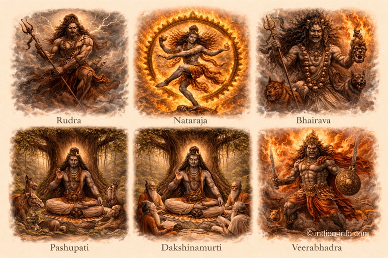Künstlerische Gesamtübersicht der wichtigsten Aspekte Shivas. Mehrere klar erkennbare Darstellungen wie Rudra, Nataraja, Bhairava, Pashupati, Dakshinamurti und Veerabhadra in getrennten Szenen. Symbolisiert die Vielfalt göttlicher Wirkweisen – von Askese und Erkenntnis bis zu Tanz, Schutz und TransformatioShiva ist einer der zentralen Götter des Hinduismus und zugleich der vielschichtigste. Er ist kein Gott mit einer einzigen Gestalt, sondern ein kosmisches Prinzip, das sich in zahlreichen Aspekten und Formen ausdrückt. Diese Aspekte stehen nicht für unterschiedliche Götter, sondern für verschiedene Wirkweisen derselben göttlichen Realität.
