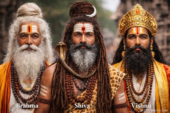 Drei hinduistische Sadhus stehen nebeneinander und symbolisieren Brahma, Shiva und Vishnu. Jede Figur trägt die jeweils typische Stirnmarkierung (Tilaka) sowie charakteristische Kleidung und Attribute.Das Bild veranschaulicht die drei zentralen Aspekte der hinduistischen Götterwelt und ihre symbolische Darstellung.