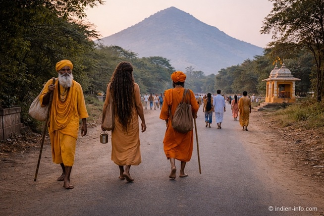 Die Girivalam-Strecke ist etwa 14 km lang und verläuft auf einem festen Rundweg um den Berg. Pilger gehen langsam, oft barfuß, teilweise schweigend. Das Gehen selbst ist die Praxis.
