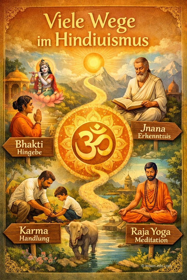 Im Hinduismus gibt es keinen einzigen „richtigen“ Pfad. Menschen sind verschieden – deshalb gibt es verschiedene spirituelle Wege, die zum selben Ziel führen: Erkenntnis und Befreiung (Moksha).