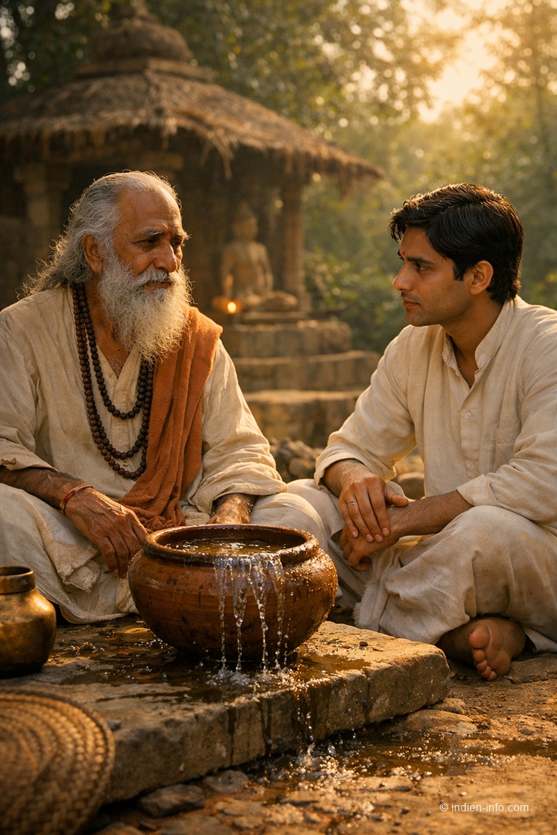 Manche Schüler sammeln Wissen wie andere Wasser in einer Schale. Je voller sie wird, desto weniger passt noch hinein. Diese Geschichte führt in einen stillen Ashram, wo ein besonders gelehriger Schüler glaubt, bereits alles Wesentliche verstanden zu haben. Der Lehrer widerspricht ihm nicht, erklärt nichts und diskutiert nicht. Stattdessen lässt er eine einfache Handlung für sich sprechen. Ohne große Worte zeigt sich, warum Wissen allein nicht trägt. Die Geschichte entfaltet ihre Weisheit langsam und unspektakulär. Sie lädt dazu ein, das Eigene kurz abzustellen und Raum entstehen zu lassen.