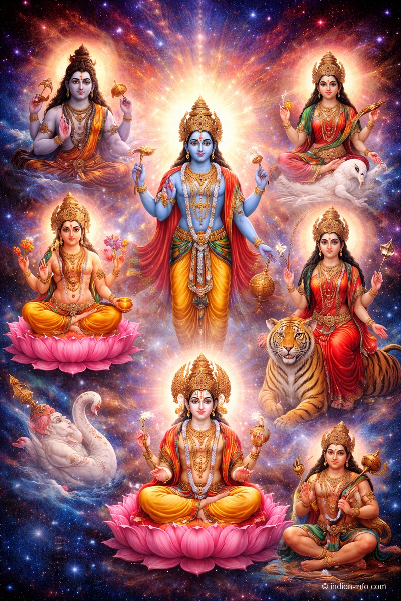 Die wichtigsten indischen Hauptgötter und Göttinnen stehen für die zentralen Kräfte des Hinduismus: Schöpfung, Erhaltung, Zerstörung, Wissen, Wohlstand und Schutz. In der hinduistischen Kosmologie sind sie eng mit dem Universum verbunden und verkörpern den ewigen Kreislauf von Entstehen, Bestehen und Wandel.
