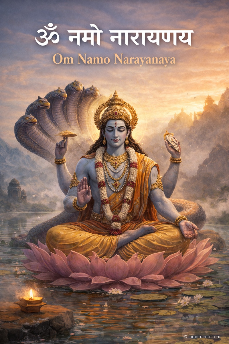 Dieses Mantra gehört zu den zentralen Vishnu-Mantras des Hinduismus. Nārāyaṇa steht für Ordnung, Schutz, Mitgefühl und kosmische Stabilität. Das Rezitieren richtet den Geist auf Vertrauen, innere Ruhe und Hingabe aus. Es wird traditionell im Bhakti-Weg verwendet, ist aber auch als stilles Meditationsmantra verbreitet.
