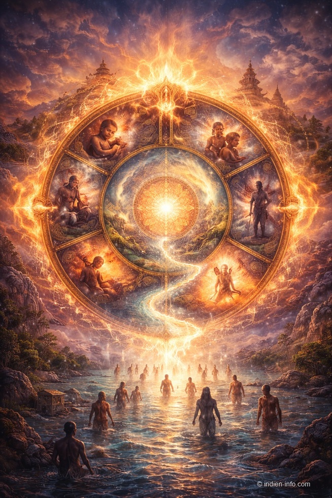 Einfach erklärt: Im Hinduismus gilt das Leben nicht als einmaliges Ereignis, sondern als Teil eines größeren Zusammenhangs. Geburt und Tod sind Übergänge. Der Mensch durchläuft verschiedene Existenzen, bis er erkennt, wer er wirklich ist. Samsara ist dabei kein Strafsystem, sondern ein natürlicher Zustand des Daseins.